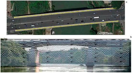 (a) The orientation of the profiles acquired along the two “wings” of the Marconi Bridge (Google Earth image); (b) is an overlap attempted to show a GPR profile showing the thickness of the “wings” and the penetration of the radar signal through the pylons and up to the surface of the river water below.