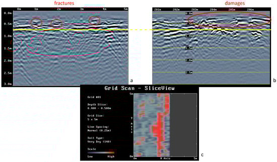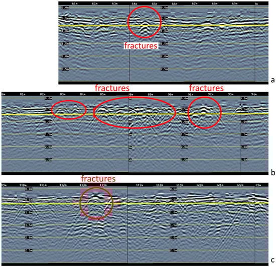 (a–c) show in greater detail the most obvious anomalies found close to the visible damaged part of the bridge (Figure 6). The yellow portion clearly shows the thickness of the wings at about 0.6 m.