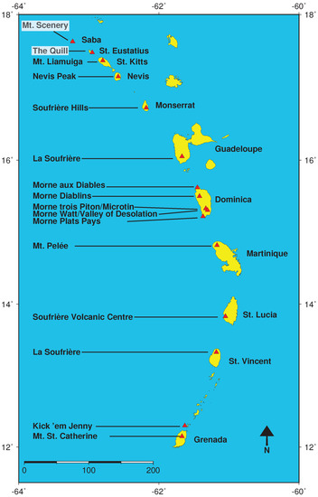 - Roobol, M.; Smith, A. Volcanology of Saba and St. Eustatius, Northern Lesser Antilles; Koninklijke Nederlandse Akademie van Wetenschappen: Amsterdam, The Netherlands, 2004; ISBN 90-6984-384-6. [Google Scholar]