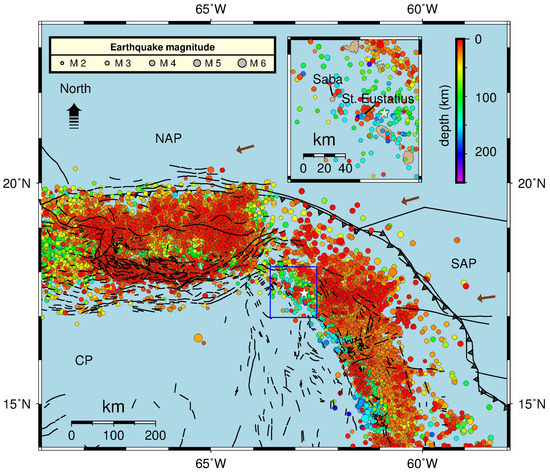 Epicentres and depths of earthquakes (M 2.0–6.1) in the region around Saba and St. Eustatius between 1 January 2010 and 15 March 2018 (data from ISC). Plate boundaries for the North American plate (NAP), South American plate (SAP) and the Caribbean plate (CP) are taken from Bird [16]. Tectonic faults [17] are indicated in black. The brown arrows represent the motion of about 20 mm per year of the NAP relative to the CP [18]. The blue rectangle on the map is enlarged on top. The white star indicates the magnitude 4.3 earthquake on 14 March 2017 at 18:35 UTC at a depth of 87 km (USGS) just east of St. Eustatius for which the waveform data are presented in Section 2.1.