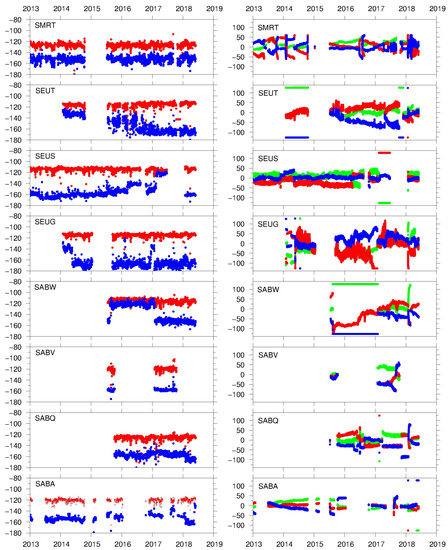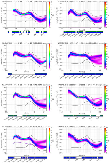 Seismic noise Probability Density Function (PDF) from the vertical component 40 sps recordings of the NA seismic stations in dB relative to ground acceleration between 1 January 2013 and 1 June 2018. The black lines are Peterson’s high and low noise models [24]. The red lines in the figures for SABA and SEUT are related to recordings that are affected by out-of-balance boom positions. The horizontal bar below the PDF plots shows the data used from each station between 1 January 2013, or the starting date of the station hereafter, and 1 June 2018. Note: because of the different starting dates of the seismic stations, the horizontal bars differ in time span. The green color in the top row represents the available data, and the red color represents data with gaps that were used in the PSD calculations. The bottom row, in blue, shows data that were used in the PDF plot. Data gaps show up as empty segments, where segments have a length of 30 min [25].