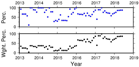 Data availability for the NA network, expressed as percentage (blue) and as weighted percentage (black) per month since 1 January 2013. The weight is the number of deployed stations in each year compared to the current number (eight) of deployed stations: three stations (SABA, SEUS, SMRT) from 2013 to 2016, and five additional stations (SABQ, SABV, SABW, SEUG, SEUT) from 2016 onwards.