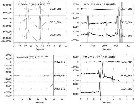 Four examples of the out-of-balance boom positions resulting in clipping of the recordings (different components). The amplitudes on the y-axis are given in counts.