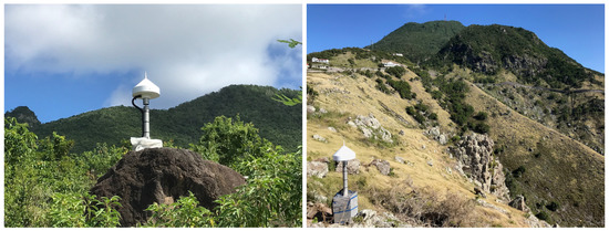 Volcanic eruptions do not always occur following typical seismic indicators. In 2016, Pavlof Volcano, Alaska, erupted a sustained ash plume, reaching 5–9 km in altitude for ~40 h without seismic precursors [27]. Also, it is not uncommon for the onset of an eruption to follow only hours after seismicity increases, as happened at Calbuco, Chile in 2015 [28] and at Hekla, Iceland in 2000 [29], allowing little time for precautionary measures. Similarly, not all volcanoes deform before erupting ([30] and references therein), or at least this precursory deformation remains undetected. The monitoring of a volcano is thus best done using multiple techniques to assess the state of activity. KNMI is, therefore, developing the monitoring system at Saba and St. Eustatius towards a multiparameter network with continuous Global Navigation Satellite System (GNSS) measurements and temperature measurements of the hot spring at Saba, both implemented in early 2018. Also, KNMI collects weather measurements at the airports of Saba, St. Eustatius, and St. Maarten. Such data are important to investigate and monitor correlations between environmental data (e.g., barometric pressure, air temperature, wind speed and direction, precipitation) and data from our volcano monitoring network.