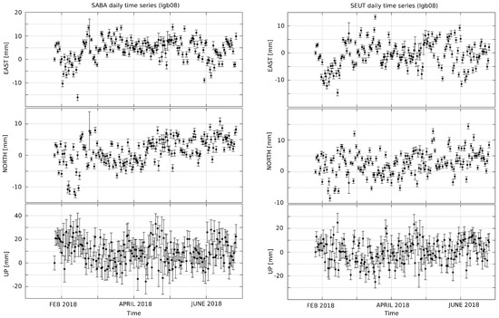 The loss of data quality due to an out-of-balance mass position in the seismometer remains to be solved. In general, the seismometer performance is strongly influenced by tilt (mainly affecting the horizontal components), pressure variation (e.g., barometric-induced tilt and deformation of the suspension system), and temperature fluctuations (air convections, change of geometry of the suspension; [26]). In order to protect the seismometer against temperature changes and human-induced tilt, the sensors were packed with dry sand in early 2018 (Figure 9). Unfortunately, this did not prevent a new case in which the mass position (or boom position) went beyond the operational range. In other words, the large relative mass acceleration, with respect to the ground, could not be compensated by the feedback system to keep the mass centered. Although the dataloggers are configured to automatically recenter the mass, sudden large amplitude accelerations cannot be compensated for and result in an unbalanced mass. Such large accelerations are usually an effect of tilting of the sensing system or deformation of the suspension system. Tilting may have local causes, like heavy traffic or groundwater movement, or atmospheric pressure variations leading to (sub)surface tilt over a larger region. The mass position plots (Figure 7) seem to indicate unidirectional tilt in some cases (e.g., SABA, SEUS, SEUT) indicated by the gentle slope of the mass position levels over longer time periods, before the instrument becomes out-of-balance. In some cases (e.g., SABV, SABW), short term (order of months) tilt seems to be approximately transverse to one of the sensor components so that the other two drift away in opposite directions.