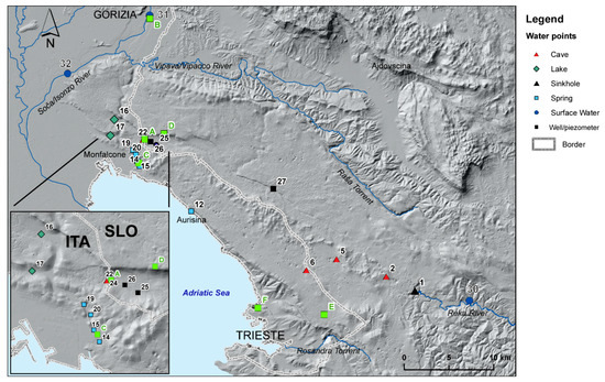 Sampling points within the study area. In the box (left below) the zoom is highlighting the spring area at San Giovanni di Duino. Green squares represent the pluviometers: A—Klariči; B—Gorizia; C—Randaccio; D—Sela na Krasu; E—Brestovizza; F—Filzi-Trieste. The other points are: Škocjanske jame (1); Kačna jama (2); Jama v Kanjaducah (5); Abisso di Trebiciano (6); Aurisina spring (12); Timavo Spring (14); Sardos Spring (15); Doberdò Lake (16); Pietrarossa Lake (17); Moschenizze North Spring (19); Moschenizze South Spring (20); B4—Klariči pumping station (22); Štorje piezometer (23); Cavernetta di Comarie (24); B2 piezometer (25); B9 piezometer (26); P1 piezometer (27); Reka River (30); Soča/Isonzo River Is1 (31); Soča/Isonzo River Is2 (32).