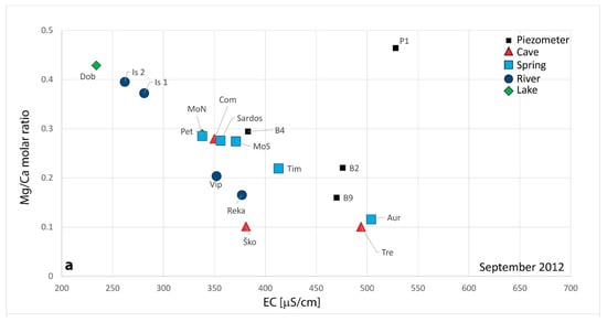 The Reka River (Rek—a monitored water point in correspondence of the surface waters of the Reka River) and Škocjanske jame (Sko—the swallow hole of the Reka River) waters, as expected, have a specific sign which shows always low EC and an average Mg2+/Ca2+ molar ratio of about 0.10–0.18 which are the expression of waters flowing on a flysch and carbonate watershed.
