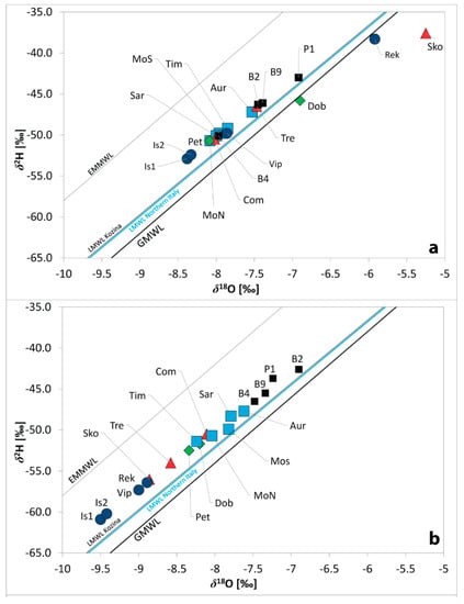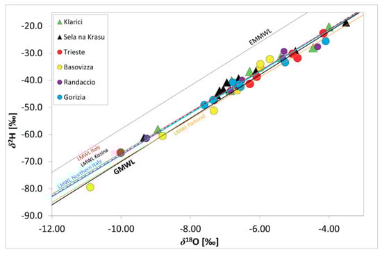 The graphs δ18O versus δ2H (Figure 6a–c) show small deviation from the GMWL. In fact, majority of water samples fall between GMWL and EMMWL as previously defined also for the precipitations (Figure 4). Water samples are plotted closely along the already identified LMWL determined for precipitation in Slovenian Kozina [69], Italy and Northern Italy [68].