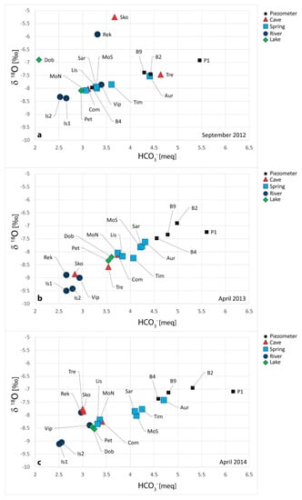 Generally, most of the water samples fall along the line linking karst waters (B2, B9 and P1) to Soča/Isonzo River component, which represent the two end members: karst waters are enriched in HCO3− and heavy oxygen isotope, while Soča/Isonzo River component is, on the other side, depleted on both parameters. Some differences can be noticed while analyzing the different sampling periods. As occurred also examining the graph EC versus Mg2+/Ca2+ molar ratio (Figure 3), on September 2012 (Figure 7a) Dob, Rek and Sko represent the outliers with very low δ18O values due to the summer evaporation. Their values in fact remain closer to the mixing line while analyzing different periods as April 2013 and April 2014. In addition, the waters sampled in correspondence of Trebiciano Abyss (Tre) have a particular behavior according to the water regime. In the sampling survey of September 2012, Tre waters have values characteristics of karst waters, completely different from the ones of the Reka River or of the Škocjanske jame defining that during low flow conditions karst waters are the ones which flow through Trebiciano Abyss. The sampling done in April 2013 (Figure 7b), realized on the decreasing limb of a high flood occurred after a period of intense rainfalls over the karst area, shows that Tre has values that differ from the ones of Rek and Sko, witnessing an important contribution of the karst waters which have always higher HCO3− and δ18O values. This contribution is even more meaningful if we look at Timavo Spring (Tim) which has higher HCO3− and δ18O values.