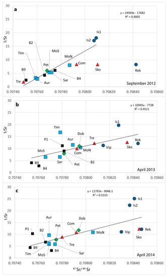 Observing the water samples collected in the area within the three-year project, it can be concluded that all the analyzed waters indicate a mixing process between a component tending to an equilibrium with the carbonate rocks (with a low Sr isotopic composition and a high Sr content) and a component tending to an equilibrium with the silica minerals having a higher radiogenic ratio and a lower Sr content as the waters coming from Soča/Isonzo and Reka rivers. The three different situations analyzed (Figure 8a–c) show in turn a complex behavior of the waters according to the specific water regime. During low flow conditions in fact, when Reka River has a very low discharge not influencing the aquifer recharge, Tre and B9 represent one of the two end members of a binary mixing line of which the other end is occupied by Soča/Isonzo waters. The regression line shows a very high R2 value of 0.90. The situation differs while analyzing the samples collected in the decreasing phase of floods (Figure 8b,c): the values are definitively more disperse, the regression lines shows very low correlation values (R2 = 0.45 in Figure 8b; R2 = 0.55 in Figure 8c) not only allowing for identifying two end members, but also suggesting the presence of more inputs to the outflows. Especially in Figure 8c, on the left end can be identified the contribution due to the karst waters represented by the waters collected in the piezometers. On the other end, the presence of the Reka and Soča/Isonzo rivers is not very distinctive since their very similar values do not allow the definition of their specific contribution to the outflows.