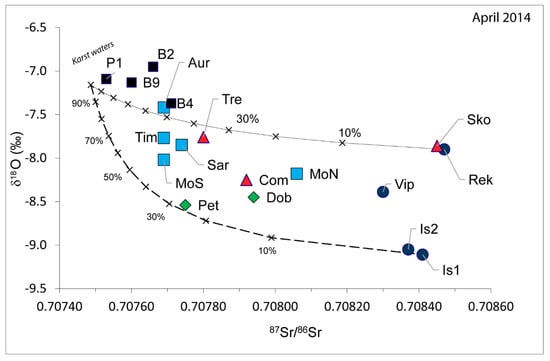 Isotopic ratio 87Sr/86Sr versus the δ18O (‰) values in water samples from April 2014. The dashed line represents a mixing line between waters having characteristics in between karst waters and Soča/Isonzo River waters; the continuous line instead, represents a mixing line between waters having characteristics in between karst waters and Reka River waters.