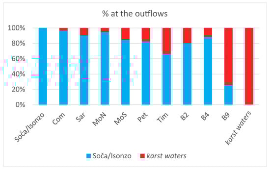 During low flow conditions, one of the components has the value of the sampled waters in Trebiciano Abyss and the other component has the value of Soča/Isonzo River in correspondence of Is2. Applying the rule exposed by Hogan et al. [95] and Négrel et al. [96], at Com we have the 97%, at Sar 90%, at MoN 95%, at MoS 85%, at Pet 83%, at Tim 66%, at B2 80%, at B4 88%, at B9 26% of Soča/Isonzo influence. The result is partially in agreement with the results obtained by Calligaris et al. [44] using the Electrical Conductivity to define the percentages of the difference contributions at the outflows. This method is applicable if the only meaningful differences in the ion composition are due to the concentration of calcium bicarbonate. The obtained values for the period 2015–2016 (a period different from the one of the project) have been, on average, lower than 15% with respect to the period considered during the project.