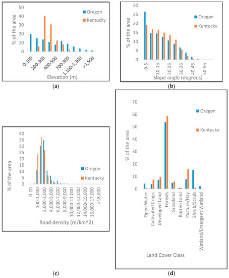 The selected study area in the state of Oregon ranges from the western coastal range to the Cascade mountains. The study area has an elevation range of 0–2072 m, a mean elevation of 420 m, and a mean slope of 14.72°. The average primary and secondary road density is 128 m/km2. This area generally experiences rainfall from October to May and relatively dry conditions from June to September [17]. The intensity of rainfall in the area ranges from 1500 mm/year to 5100 mm/year [18], while the average snowfall can range from 25 mm/year to 380 mm/year. However, the winter precipitation in the area usually occurs in the form of rainfall, although it is subject to occasional heavy snowfall as well [19]. The selected study area in Kentucky, which is situated along the northern mountainous region of Kentucky, has an elevation range of 131 m–892 m, a mean elevation of 341 m, and a slope of 15.22°. This area has an average primary and secondary road density of 338 m/km2. The average rainfall of the area is 1143 mm/year to 1270 mm/year, with the rainfall being quite evenly distributed throughout the year [20]. However, the snowfall in northern Kentucky has a mean value that is close to 635 mm/year, which is much higher than that of Oregon [20]. The soil slides and non-soil slides from the two study areas were selected from locations consisting of similar rock types, namely basalt, siltstone, sandstone, and mudstone, so that any variation of rock type between the two study areas would not affect the model performance. Furthermore, the frequency distributions of slope, elevation, primary and secondary road density, and land cover are included in Figure 2a–d. It should be noted that the plotted road density (Figure 2c) corresponds only to pixels where a primary or a secondary road was present.
