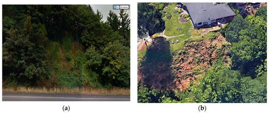 Figure 4a,b contains current images of two selected soil slide locations from the landslide database. These locations are identified as soil failures (and not rock failures) since the color of the exposed slope, presence of vegetation in the vicinity, shallow depth of failure, and lack of sliding grooves indicate so. Finally, it was further observed that there are several soil slides in the database that had occurred on a single day. In these situations, some soil slides may have been triggered by a precursor soil slide. Thus, in such cases, the successor soil slides cannot be considered as independent events, and must be excluded from the analysis. To do so, any soil slide with small dimensions occurring within a distance of two times or less than the larger dimension of a larger soil slide occurring on the same day were excluded from the study.