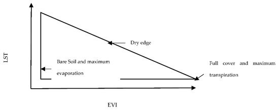 Triangular relationship between land surface temperature (LST) and the enhanced vegetation index (EVI).