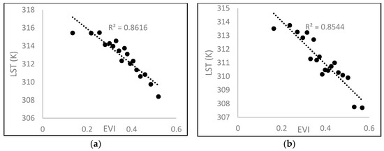 where T represents the observed LST, Tmin represents the minimum LST observed on the LST–EVI space, and a and b are the parameters representing the dry edge of the LST–EVI space. The resolution of soil moisture can be improved with TVDI using Equation (3).