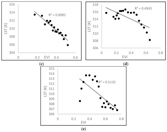 The LST–EVI dry edge parameters that were developed for the three downscaling windows of the Oregon study area and two downscaling windows of the Kentucky study area using linear regression are given in Figure 9a–e. For the three windows of Oregon, the LST and EVI values produced good correlation coefficients along the dry edge whereas for the two windows of Kentucky, the correlations were lower, especially at lower EVI values.
