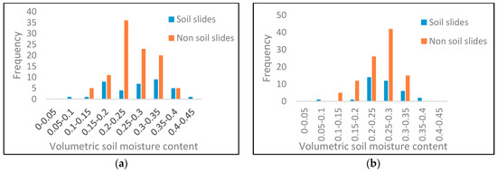 The frequency distributions of downscaled and undownscaled soil moisture are given in Figure 10a and Figure 11b, respectively. Furthermore, the means and standard deviations of downscaled and undownscaled soil moisture are given in Table 2. The mean and standard deviation of downscaled soil moisture at the soil slide locations were 0.2787 and 0.075, respectively, while those of the non-soil slide locations were 0.2523 and 0.0585 respectively. On the other hand, the mean and standard deviation of the undownscaled soil moisture content at the soil slide locations were 0.2682 and 0.0519, respectively, while those at non-soil slide locations were 0.2503 and 0.0478, respectively. It could be observed that the mean soil moisture content at the soil slide locations was higher than those at the non-soil slide locations for both downscaled and undownscaled soil moisture contents. However, downscaling increased the mean soil moisture at the soil slide locations, thereby leading to a larger difference between the means of the soil slide and non-soil slide locations. Moreover, downscaling increased the standard deviation of soil moisture content at both the soil slide and non-soil slide locations.
