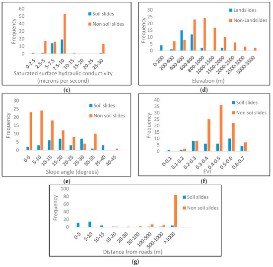 The frequency distributions of elevation and slope are given in Figure 10d,e respectively. The mean elevation of the soil slide locations (189 m) was much lower than that of the non-soil slide locations (335 m). This is because the majority of the slope failures in this study occurred in close proximity to primary and secondary roads. Since primary and secondary roads are built on lower elevations, the mean elevation of soil slide locations is expected to be much lower than that of non-soil slide locations. Furthermore, it can be observed from Table 2 that the mean slope angle of the soil slide locations (20.93) was much higher than that of the non-soil slide locations (13.34), indicating that a higher slope angle leads to an elevated soil slide hazard.