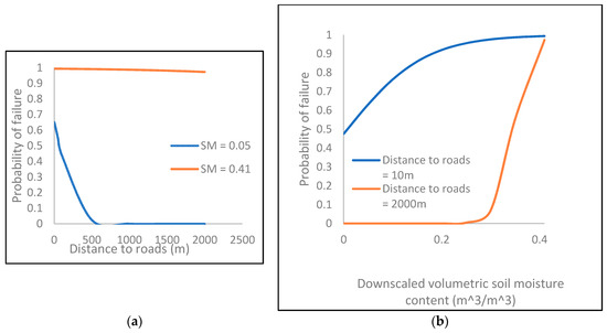 The soil moisture content was kept constant at a low value (0.05) and a high value (0.41) respectively, and the variation of soil slide hazard with the distance to roads was observed (Figure 11a). As expected, the probability of failure decreased with the increase of distance from roads. However, the probability of failure is higher at the high moisture level. In fact, at the higher moisture level, the reduction of soil slide hazard with the increase of distance from roads is minimal. Similarly, the distance from roads was kept constant at a low value (10 m) and a high value (2000 m), respectively, and the variation of the probability of failure was observed (Figure 11b). It can be observed that the location at a shorter distance from roads displays an elevated soil slide hazard at the same moisture content, compared to the farther location from a road. The above results indicate that locations with elevated moisture levels that are located closer to roads will experience the highest soil slide hazard compared to locations with the same moisture levels but that are located farther away from roads, or locations that are closer to roads but with lower moisture levels.