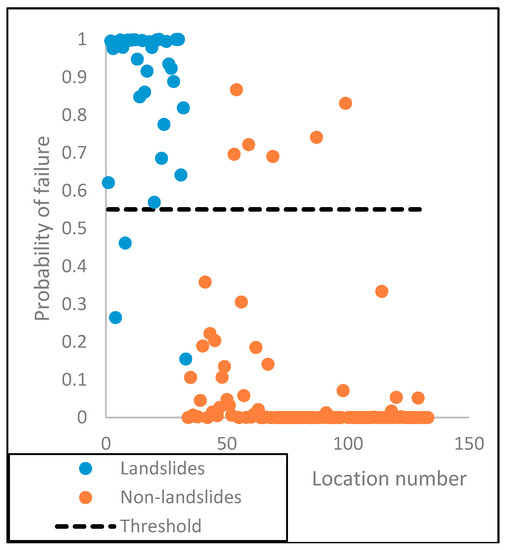 It must be noted that the probability of failure defined by the logistic regression model is merely a hazard index, and it does not provide a threshold for the occurrence of a soil slide. Hence, as the final step of the process, a threshold probability of failure was determined by maximizing the classification accuracy between soil slide and non-soil slide locations. Classification accuracy is defined in Equation (8):