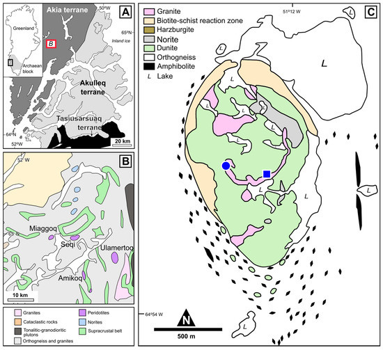 The Archaean craton of southern West Greenland can be subdivided into several tectono-magmatic terranes [18]. For the Nuuk region, the relevant terranes are the Akia, Akulleq, and Tarsiusarsuaq, from north to south (Figure 1A) [19,20]. The Archaean North Atlantic Craton is bounded by Proterozoic orogens known as the Nagssugtoqidian (north) and Ketilidian (south) [21]. The Fiskefjord area in the central Akia terrane is dominated by amphibolites, dioritic to tonalitic orthogneisses, and peridotites. The peridotites occur as large discontinuous lensoid bodies within tonalitic orthogneiss. Exposures of these peridotites can be found in the Miaggoq, Seqi, Ulamertoq, and Amikoq ultramafic bodies, which are also associated with noritic rocks [1] (Figure 1B).