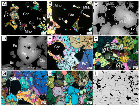 (A,B) Photomicrographs of samples with zoned chromites (Chr) showing interstitial silicate minerals that include enstatite (En), magnesiohornblende (Mhb), forsterite (Fo), and clinochlore (Clc); (C,D) Backscattered electron (BSE) images of the zoned chromites showing a gradual change from bright cores to dark rims. Outer rims occur as irregular overgrowths and have sharp contacts with dark rims; (E,F) Photomicrographs of the peridotite envelope (E) and host (F) of the chromitite hosting zoned chromites; (G,H) The peridotite host of the homogeneous chromites lacks orthopyroxenes, but contains diopside (Di) and tremolite (Tr); (I) BSE image of the homogenous chromite shows uniform brightness from core to rim.