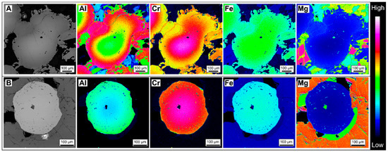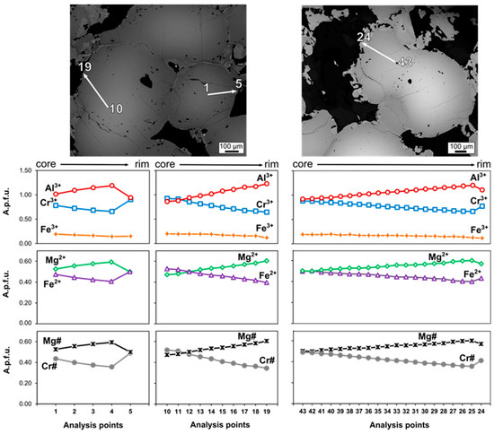 Chromitites that contain zoned chromites have massive texture. The chromites occur as subhedral to euhedral grains (up to 500 μm). Zonations are observed in backscattered electron (BSE) images, which show concentric variation from bright cores to dark rims. The contrast from core to rim observed in BSE images can be correlated with compositional variation (Section 4.2) (Figure 2C,D and Figure 3). The cores of the zoned chromites are Cr- and Fe-rich, which decrease steadily toward the rim. In contrast, the concentrations of Al and Mg progressively increase away from the core. Thin overgrowths having intermediate composition relative to the core and rim appear as irregular light gray “outer rims” in the BSE images (Figure 2C,D). The outer rims have sharp contacts with the dark rims of the zoned chromites. Zonation is clearer in coarser chromite grains than in finer grains. Chromite core chemistry was analyzed from the brightest portion of a grain (BSE images), and shows a wide range of compositions within a single thin section. Inclusions in the chromites are mainly amphibole, orthopyroxene, and chlorite, which also commonly occur as interstitial minerals between chromites (Figure 2A–D). The portions within chromite enclosing the silicate inclusions are dark in the BSE images, suggesting that the composition of chromite is affected by the included and surrounding silicate phases. Elemental diffusion in the presence of Al-rich phases has been demonstrated by previous studies on zoned chromites from other localities (e.g., Red Mountain in New Zealand [23]; Rhum layered intrusion in Scotland [7], and the Yanmenguan mafic-ultramafic complex in China [24]). The peridotite envelope and host consist mainly of olivine, orthopyroxene, magnesiohornblende, phlogopite, and accessory chromite (Figure 2E–G). The accessory chromites in the peridotite envelope are also zoned similar to those in the chromite-rich zone. However, accessory chromites in the host have different textures that are more irregular to subhedral with Cr-rich thin rims (Cr# = 0.37–0.58). The chromite rims have porous textures and contain fine chlorite inclusions (Figure 2C).