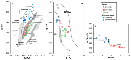 (A) Spinel Mg# [(Mg/Mg + Fe2+) atomic ratio] vs. Cr# [(Cr/Cr + Al) atomic ratio] plot showing higher and less variable Cr# and Mg# for the homogeneous chromites, while zoned chromites have a wide range of Cr# and Mg#. However, the accessory chromites in the peridotite host have higher Cr#; (B) Forsterite content vs. Cr# of olivine–spinel pairs of the Ulamertoq samples. Fields of the olivine–spinel mantle array (OSMA) [4] and Seqi ultramafic complex [1] are shown for reference; (C) The homogeneous chromites are characterized by higher TiO2 contents compared to the zoned chromites. Fields for Rhum layered complex [29], Ujaragssuit [30], and Fiskenaesset [31] are included for comparison.
