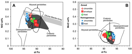 The olivine grains interstitial to the homogeneous chromites and those within its host have a narrow range of forsterite contents (Fo = 93.5–94.1 wt % and 93.4–93.7 wt %, respectively) which is higher than those associated with zoned chromites. It is also shown in the OSMA (olivine–spinel mantle array) diagram [4] that the olivine forsterite content in the sample with homogenous chromites is slightly higher relative to those with zoned chromites, as also shown in Figure 4B. The olivine NiO content values related with the homogeneous chromites (0.31–0.44 wt %) are comparable to those with the zoned chromites (Figure 5A). The olivine MnO contents in both types of chromites are almost similar.