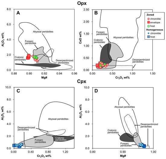 The Mg# and Cr2O3 contents of the orthopyroxenes (enstatite) in the chromitites with zoned chromites (0.91, 0.20–0.37 wt %, respectively) and those within the peridotite host (0.91, 0.21–0.30, respectively) are slightly higher compared to those from the peridotite envelope (0.90, 0.12–0.19, respectively). The orthopyroxene Al2O3 content is also low (1.2–1.9 wt %). Clinopyroxenes associated with the homogeneous chromites and its peridotite host also have low Al2O3 contents (0.32–0.68 wt %) with a wide-ranging Cr2O3 (0.00–0.17 wt %) and less variable Mg# (0.96–0.97) (Figure 6C,D).