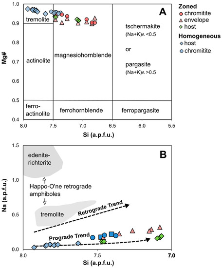 Amphiboles in both types of chromitites and their peridotite hosts are mainly magnesiohornblende [Mg# = 0.90–0.96, Si a.p.f.u. (atoms per formula unit) = 6.79–7.48 (a.p.f.u. for O = 23)]. Tremolites were only observed in the homogeneous chromitites and its peridotite host with higher Mg# (0.95–0.97) and Si a.p.f.u. (7.53–7.93) (Figure 7).