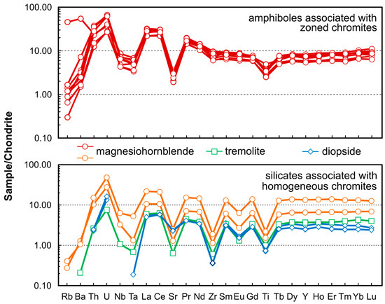 Amphiboles show similar patterns in the chondrite-normalized spider diagram, with a more pronounced Sr anomaly compared to the clinopyroxenes (Figure 8).