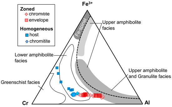 Several textural and chemical features of the peridotite envelope and host represent metamorphic imprints on the Ulamertoq peridotite body. The variable compositions of the chromite cores, with a significant increase in Al and Mg coupled with Cr and Fe2+ decrease from core to rim, suggest that the Ulamertoq chromitites were modified under prograde metamorphism. Chromites that were metamorphosed at low temperatures typically have low Al contents [51]. Metamorphic reactions above 550 °C with surrounding silicates and infiltrating fluids will modify the trivalent cation chemistry of the chromites [52,53]. Comparison with other metamorphic spinels from various metamorphic grades places the zoned chromites from Ulamertoq between the fields of lower amphibolite and upper amphibolite–granulite facies (Figure 10).