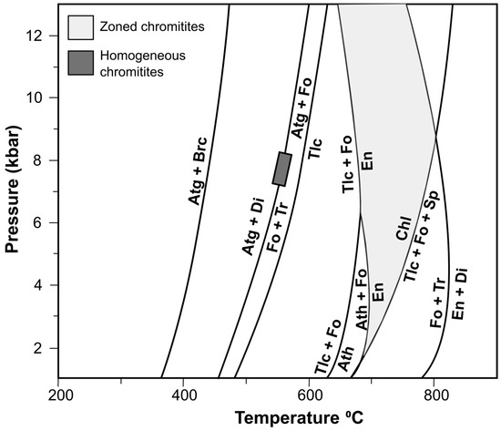 The absence of plagioclase and garnet restricts the pressure of the Ulamertoq ultramafic rocks within the spinel stability field. The transition from plagioclase to spinel in lherzolites occurs within 0.6–0.8 GPa [61,62,63], and spinel-to-garnet lherzolite transitions at 3.0 GPa, depending on the Cr# of the system [64,65]. Hence, the equilibration temperature condition of the Ulamertoq peridotite may be between these transition pressures. Pressure constraints may only be based on the presence of chromite in the spinel stability field, although the possibility of coexistence of the assemblages in both types of chromitites and associated peridotites above 14 kbar (CaO-MgO-SiO2-H2O phase equilibria) is not disregarded (Figure 11).