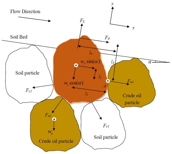 Wilson [] developed a non-linear model to estimate erosion rates, based on stabilizing and removing forces and associated moment lengths for particle displacement. The forces that act to remove soil particles in the presence of crude oil are presented in Figure 1. These forces include the weight of the soil particle , drag force , lift forces , the contact forces between adjacent soil particles , and the contact forces between adjacent soil particles and adjacent oil particles . Particle detachment takes place if the resisting moment is less than the driving moment []. In this study, the Wilson model was modified to include the influence of oil contamination, based on the original framework developed by Wilson []. The detachment of soil particles is expected to occur if the drag force is higher than the cohesive force and weight, relative to the moment around point A, and can be defined with the introduction of the terms and as the following Equations (1)–(4):