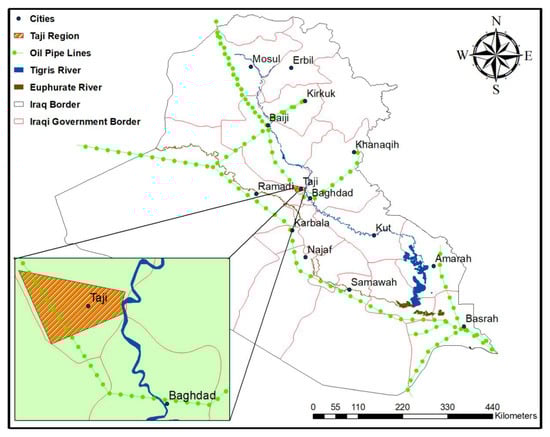 The location of the study area (Taji region) and crude oil pipelines in Iraq.