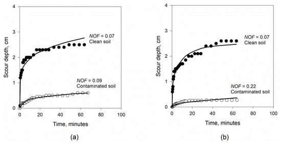 Crude oil affected the observed scour-depth readings in the “mini” JET experiments. Examples for both the large-scale (in-situ soil box) and small-scale (standard mold) setups of scour depth data versus recording times at the dry side of packed contaminated soils are shown in Figure 4. Lower erosion rates were observed in both scale setups. The model was evaluated based on the Normalised Objective Function (NOF) using JET data for both scales (Figure 4). This was to examine how the Wilson model would fit the observed data. The NOFs were 0.09 and 0.22 for crude-oil-contaminated soil at small and large-scale setups, respectively (Figure 4). The NOF was 0.07 for clean soil at both scale setups. Consequentially, the Wilson model data fitted well the JET observed data.