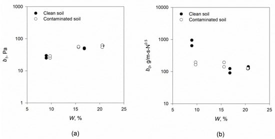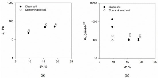Derived b1 and b0 from the “mini” JET device for small scale at three different soil moisture contents for clean and crude oil contaminated soils: (a) parameter b1 and (b) parameter b0.