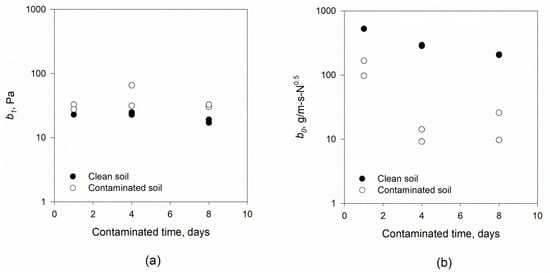 To investigate the influence of crude oil at dry moisture content in detail, Wilson parameters b0 and b1 were also derived from the JET data for clean and crude-oil-contaminated soils with the small-scale setup as an example at three different contamination times (1st, 4th, and 8th days) (Figure 7). There was no influence of the contamination times on the b1 values for either of the clean or oil-contaminated soils (Figure 7a). ANOVA reported that there was no statistically significant difference between clean and contaminated soil for parameter b1 (with p > 0.05), excluding the observed b1 at 8 days of contamination (Table 5). Figure 7b indicates an inverse relationship between the b0 value and contamination time for contaminated soils. A significant reduction in b0 was found for crude-oil-contaminated dry soil as the contamination time increased in comparison to clean soil. This was due to the low soil moisture content and increased contamination time allowing more crude oil particles to occupy the soil pores. ANOVA confirmed that the results shown in Figure 7b have statistically significant differences between clean and contaminated soil for the observed b0 parameter (with p < 0.05), excluding the observed b0 on the first day of contamination (Table 5).