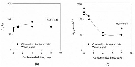 The predictive equations for b0 and b1 from the parameters without crude oil appropriately estimated the derived parameter values from JETs with small-scale setup and at different contamination times (see Figure 8). The Wilson parameters at zero contaminated time referred to values of b1 and b0 at clean soils (without contamination by crude oil). The NOF of prediction parameters versus observed data were 0.10 and 0.03 for b1 and b0, respectively. The prediction of b1 was based on the dimensionless parameter, based on soil and oil cohesions fco. The prediction of b0 was based on the crude oil coefficient ratio and Ke. Table 5 shows that the parameters fco and increased as contamination time increased until equilibrium was reached. These parameters are a function of soil and oil particle cohesion and contamination time based on the chemical-physical bonds between soil and oil particles. Additional research is needed to verify the values of fco and for different soil textures at different contamination levels.