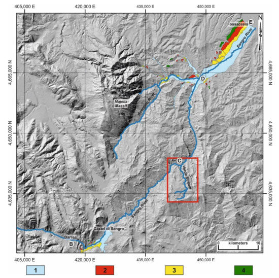 Fluvial terraces schema of the middle-lower Sangro River valley. In blue, the drainage network; the red box frames the drainage basin object of this work. Letters refer to Figure 1 (modified from [2,12,34]). Legend: (1) fourth order terrace—alluvial plane (Holocene); (2) third order terrace (Late Pleistocene); (3) second order terrace (late Middle Pleistocene); (4) first order terrace (Middle Pleistocene).
