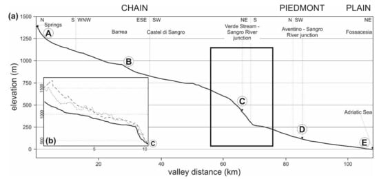 (a) Plot of the Sangro River’s long profile and location of the study area (box) (modified from [2]); (b) Plot of the Verde Stream’s long profile; stream profile is shown in black line; dotted line is the right side ridge-line profile; dashed line is left side ridge-profile. Location in Figure 1 (letters A, B, C, D, E).