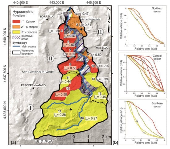 Basins with concave hypsometric curves occur mostly in the southern Verde area at the highest elevations and close to the southern ridges, and hypsometric integrals show low values (ʃips < 0.45). The central sector is characterized by markedly convex curves (except for a couple of concave curves at the transition with the southern slope). The values of the hypsometric integral range from high to very high (0.55 < ʃips < 0.80). The northern sector show S-shape curves with intermediate integral values (0.45 < ʃips < 0.50). This peculiar setting (Figure 8) outlines an intermediate erosion stage with large dissection in the northern sector of the basin close to the junction with the Sangro River and, as expected, downstream from the Verde Waterfalls. Poor erosion with prevailing linear erosion characterizes the intermediate sector outlining an incipient dissection. The southern sector is hanging at the highest elevation, dominated by areal erosion and not affected by dissection except for a single basin at the transition with central sector.