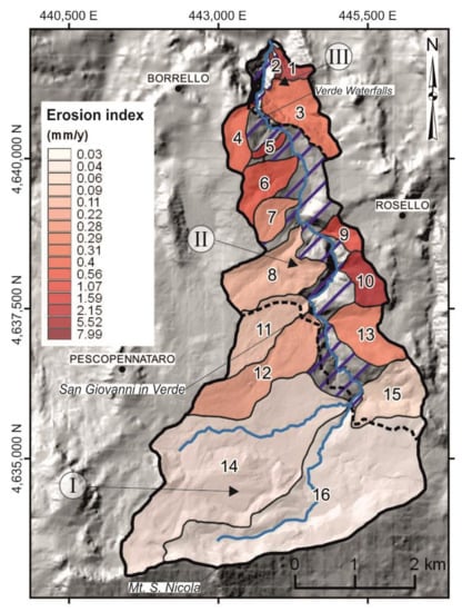 Erosion index map (numbers refer to the drainage sub-basin). The dashed black line indicates the orographic sector boundary (numbers I, II, III); the blue line, the main course of the Verde Stream; the black line, the watershed boundary.