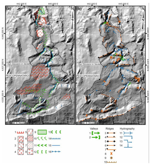 (a) Map of the fluvial and slope gravity landforms. In black: the watershed boundary. Legend: (1) degradational and/or landslide scarp; (2) soil creep; (3) rotational slide; (4) translational slide; (5) earthflow; (6) complex landslide; (7) deep-seated gravitational slope deformation (DSGSD); (8) rockfall; (9) badlands area; (10) asymmetric valley; (11) V-shaped valley; (12) flat bottom valley; (13) concave valley; (14) fluvial erosion scarp; (15) gully; (16) entrenched fluvial segment. (b) Morphotectonic scheme. In black: the watershed boundary. Legend: (1) beheaded valley; (2) hanging valley; (3) straight symmetric ridge; (4) straight asymmetric ridge; (5) ridge; (6) altimetric discontinuities of ridge; (7) planimetric discontinuities of ridge; (8) saddle; (9) isolated relief; (10) structural scarp; (11) rectilinear fluvial segment; (12) river bend; (13) double river bend; (14) 90° confluence.