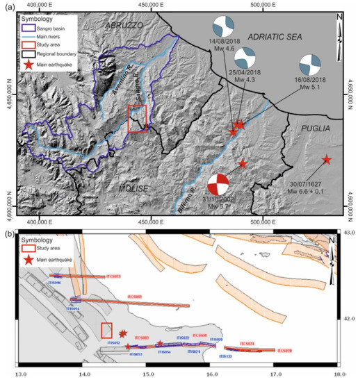 Moreover, the surface morphotectonic evidence can be confirmed by the recent seismicity occurred after the geomorphological investigation from April to August 2018 that outlines recent activity of E–W deep tectonic structures in the Molise area. This is also supported by more eastern tectonic structures responsible for historical and recent earthquakes connected to E–W structures (e.g., 1627 Mw 6.8; 2012 Mw 5.72 [6,7,8]) (Figure 13).