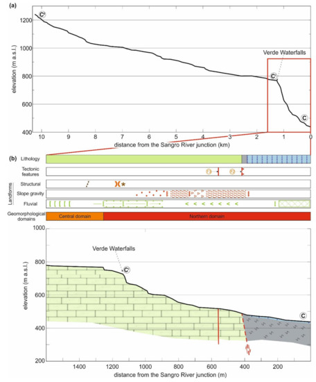 (a) The Verde Stream’s long profile; (b) geomorphological section of the northern reach of the Verde Stream’s long profile (red box); location in Figure 1, Figure 2, Figure 3, Figure 4, Figure 5, Figure 6, Figure 7, Figure 8, Figure 9, Figure 10, Figure 11, Figure 12, Figure 13 and Figure 14 (letters C, C’, C”).