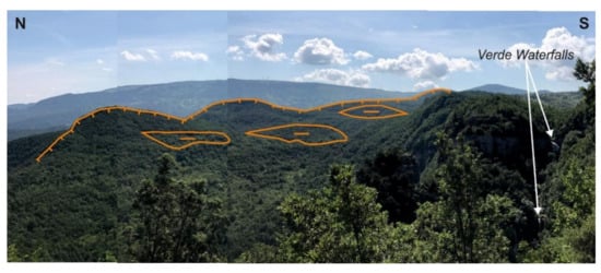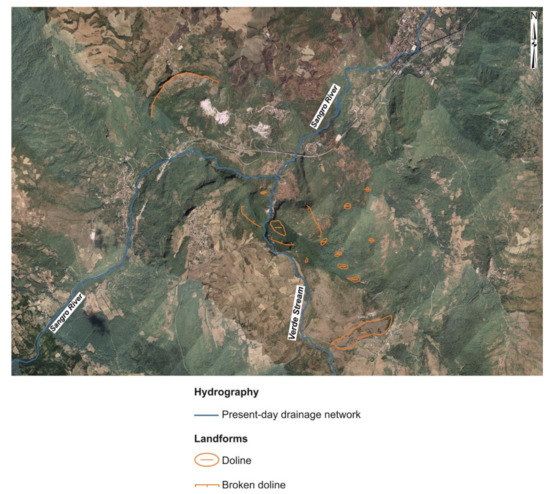 The karst morphogenesis is a widely developed process in the Central Apennines chain and may represent a key element in understanding the landscape evolution of the study area. Usually, this aspect is underestimated in several works that focused on Quaternary fluvial geomorphological analysis. For this reason, the results of the morphotectonic and geomorphological analysis were compared with the distribution of the karst features found near the Verde Waterfalls and represented by several small doline and a large broken doline (Figure 16 and Figure 17), located at an altitude from 580 to 780 m a.s.l. Therefore, the Verde Stream catchment area is connected to karst features and can be considered as a karst groundwater system with perennial flows rate observable in the waterfalls area [65].