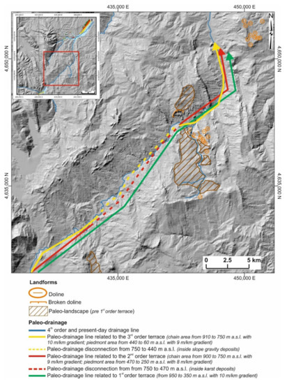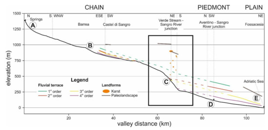 Finally, the results of the local investigations in the Verde Stream catchment area were integrated with the analysis of the junction area with the Sangro River and with the analysis of the Sangro’s long profile compared with previous work in the inner mountain area and in the piedmont area. This analysis outlined the distribution of karst landforms and hanging landscapes in the middle Sangro River valley and these features were compared to the montane and piedmont fluvial terraces through the long profile in order to outline the main steps of the landscape evolution of this area [2,12,34].